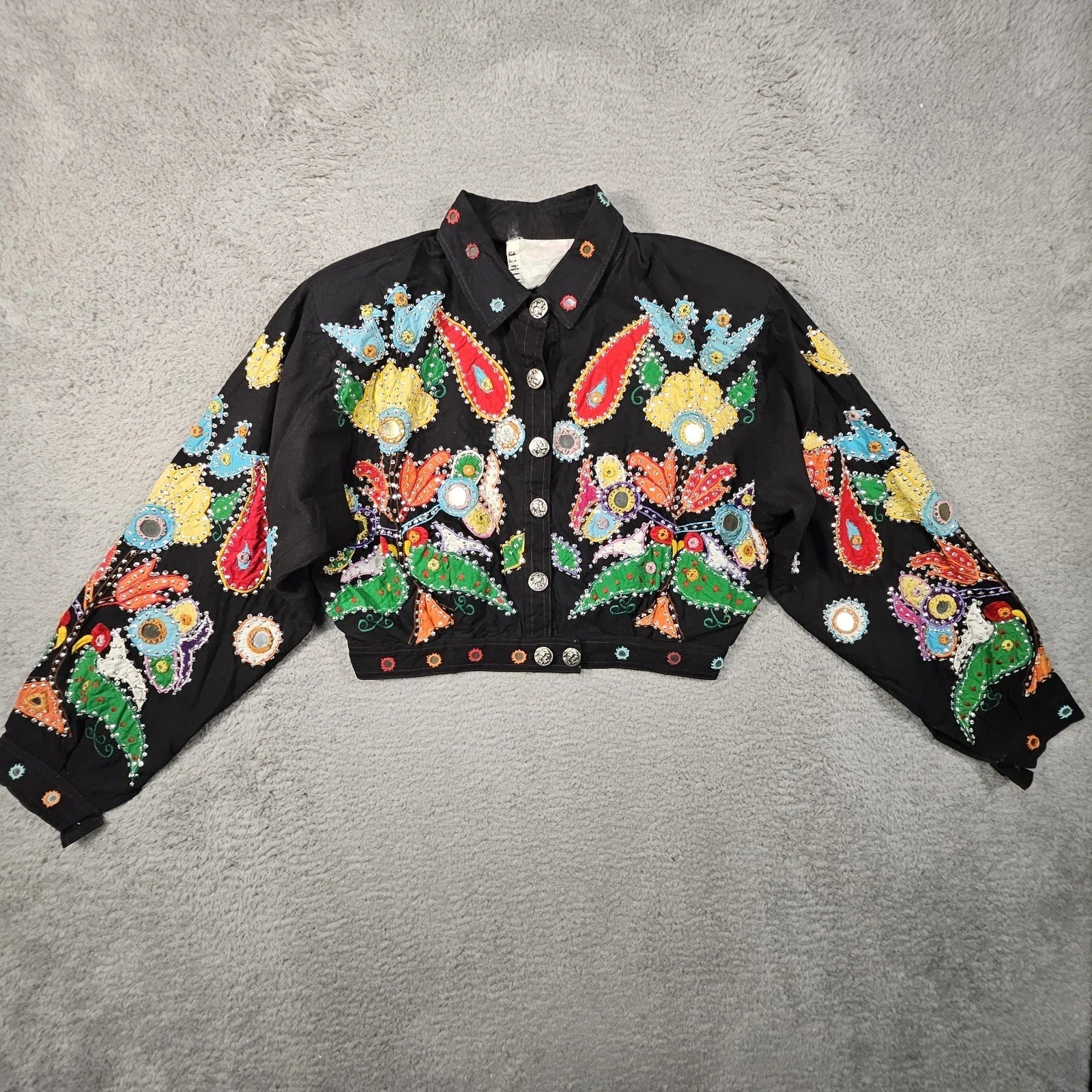 Gorgeous Rockstar Boho Vintage black cotton oversized cropped jacket sparkly embroidered flowers with mirrors Faux Buffalo Nickel buttons 1990’s
